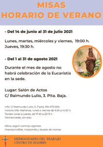Desde el Centro de Madrid de Hermandades del Trabajo compartimos los horarios de verano 2021 de las Eucaristías, reuniones del Grupo «Lectura del Evangelio» y Administración.